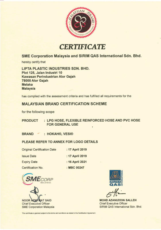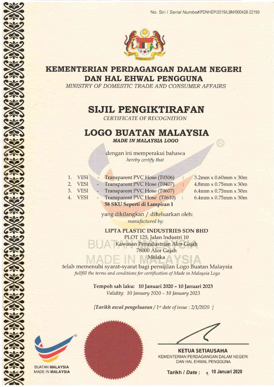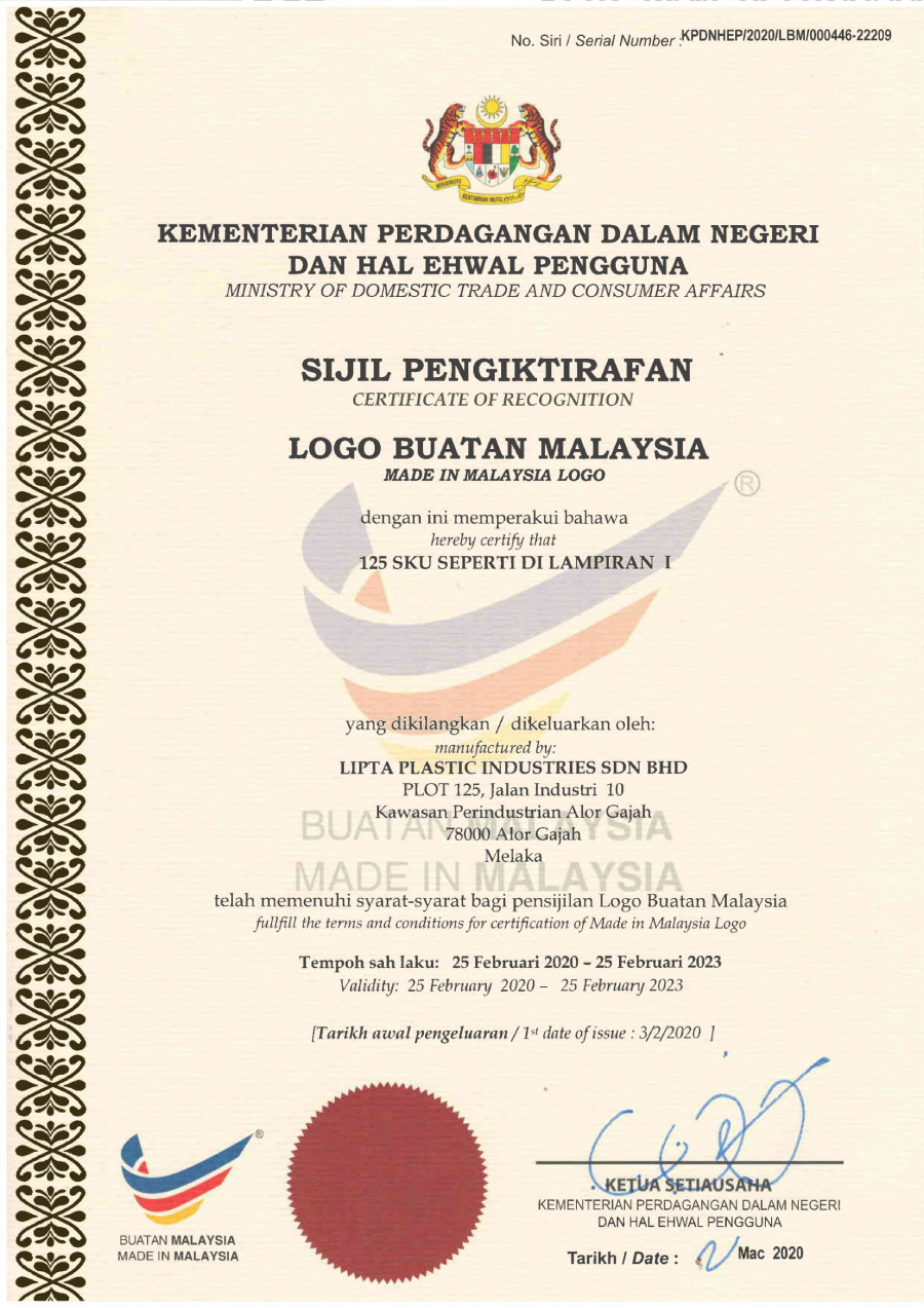 This is to certified that Lipta Plastic Industries Sdn.Bhd products which is Branded under HOKAH & VESI is fully manufacture in Malaysia and of high quality. Learn more at www.kpdnhep.gov.my