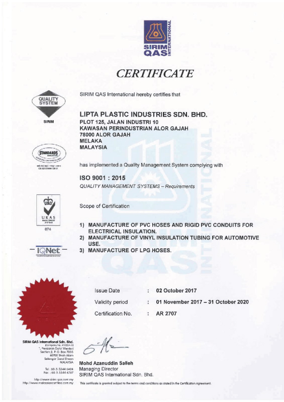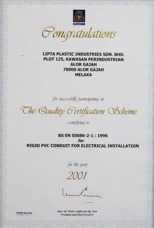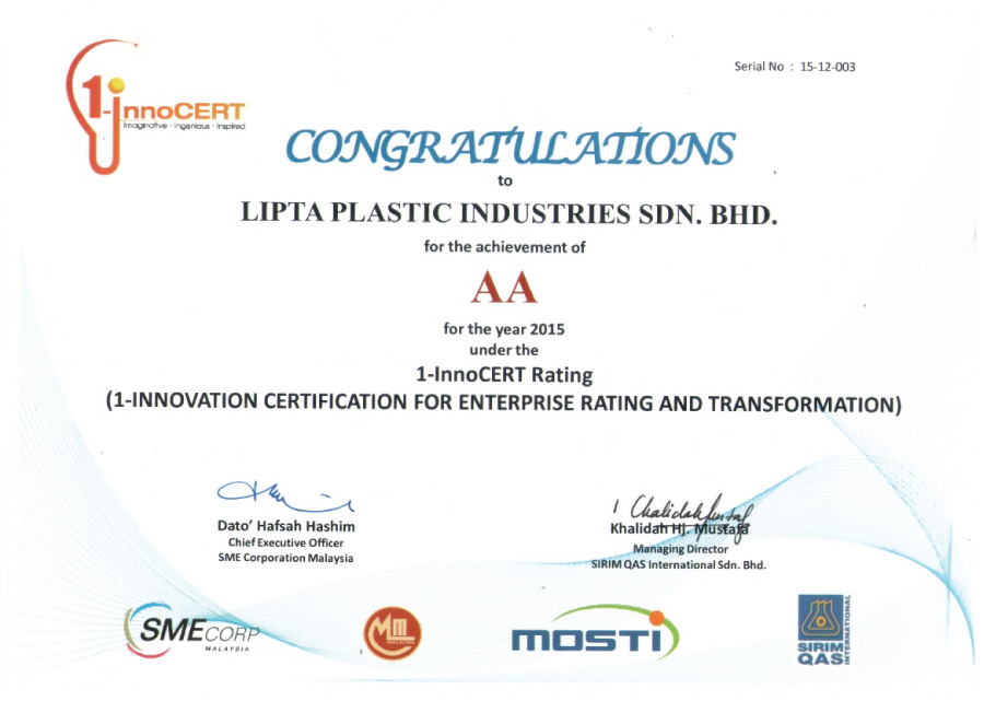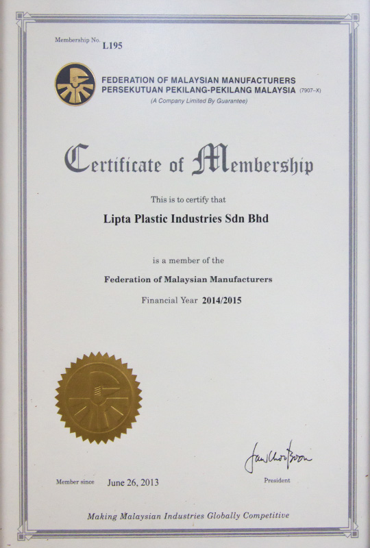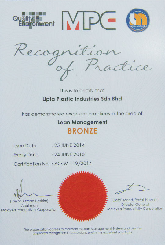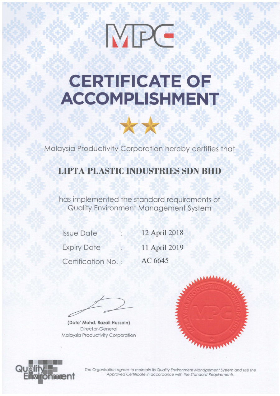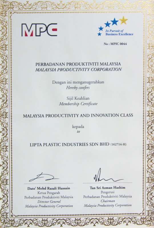 The Malaysian Productivity Corporation (MPC) which was formerly known as the National Productivity Corporation was established in 1962, Lipta Plastic Industries Sdn.Bhd was awarded for Quality Environment Management System in 2013. Learn more at www.mpc.gov.my